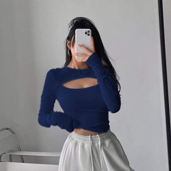 Crop Top Korea Lengan Panjang Wanita - Baju Kaos Atasan Crop Korea - Rayon Spandek 6016